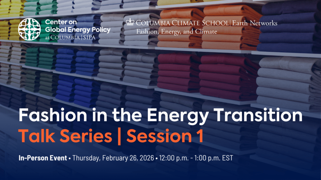 The Center on Global Energy Policy (CGEP) at Columbia SIPA and the Fashion, Energy, and Climate Network invite you to join the first session of our new talk series: Fashion in the Energy Transition, designed to connect the fashion and apparel value chain to the broader energy transition and climate change agenda.